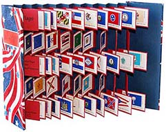 Flying Flags Book springs open to wave all 50 US state flag postage stamps issued in 1976 in a structure appropriately named a flag book structure. |