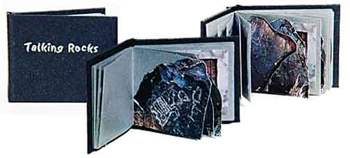 In the New Mexico desert, the ancient native people chipped petroglyphs on big blackened boulders revealing the lighter rock underneath. I found the viewing of the petroglyphs an experience in itself. You had to walk around and view the images individually, all though some boulders were close together and you sometimes could see another drawings over the shoulder of the rock in front of you. Other times you had to walk a ways with eyes sharp to spot others, not all the boulders had images. Like all my books, I wanted this book to reflect the essence of the place and the experience I had. Talking Rocks takes you to these drawing grounds with close-ups of intriguing images and whole boulders cut out from the page, allowing you to travel through the book rock by rock just like you were there. The rocks had a sheen that was micro sparkly. A couple of days later I was in Denver and stopped in at Paper Pleasures, a paper store. There I came across a black paper that looked just like the rock surface with the subtle sheen. I knew it was perfect for the book cover and book case. Talking Rocks Includes an introduction and colophon. The book is printed using Giclee, a museum quality digital printing method. The book is 2.25Ó x 2.75Ó, has 42 pages with 17 photographs. All the rock cutouts are cut by hand, a few books at a time! Limited to an edition of 50, with an optional, but recommended matching slip case. |