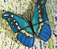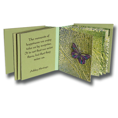 Is happiness elusive as a butterfly? This little book Happiness is filled with dimensional butterflies made from that plastic material called "Shrinky Dink". That plastic material that as a kid you could draw or color on, then cut out in shapes, bake for a few minutes in the oven, and it magically shrinks 40-50%. I some how missed the opportunity to play with the stuff as a kid. Happiness is my excuse to play with it now. Happiness has seven appropriate quotes by famous folks, each accompanied by a shrinky dink butterfly on a rubber-stamped background. Comes with a two-toned clamshell case to keep pages and butterflies contained. The book is 2.25" x 2.63" x 2", open edition.